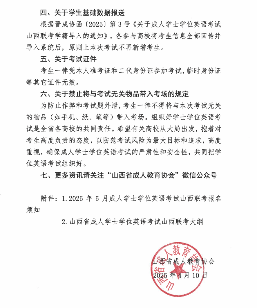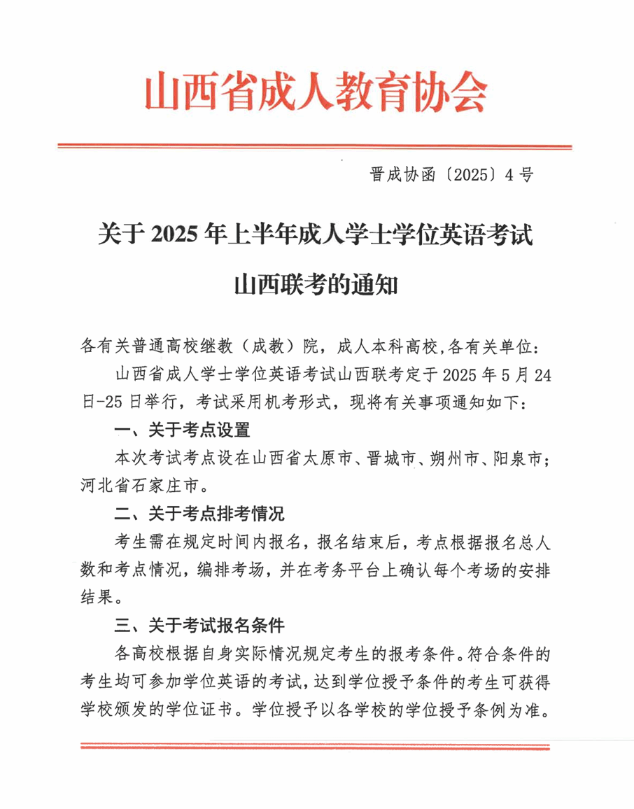 关于2025年上半年成人学士学位英语考试山西联考的通知